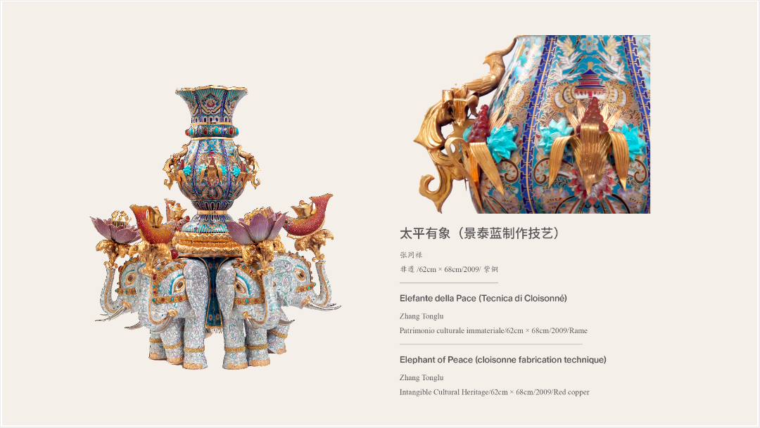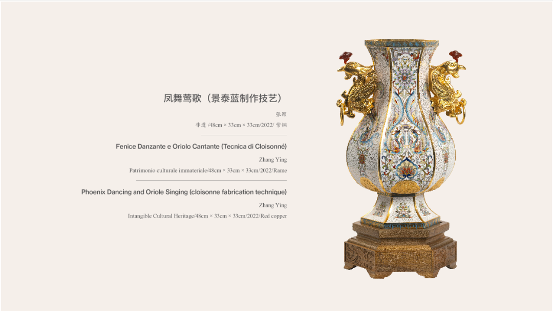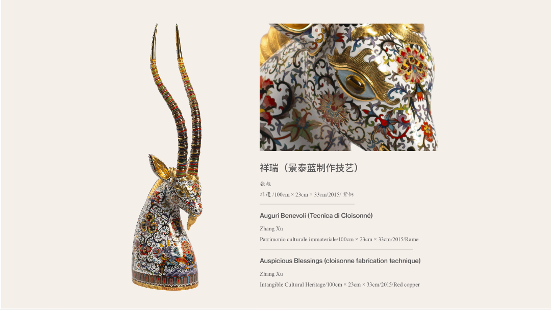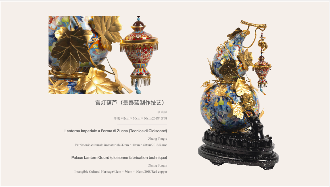 展览期间,国家级非物质文化遗产代表性项目景泰蓝制作技艺代表性传承人张旭、张颖向中宣部副部长、中央广播电视总台台长慎海雄,意大利教育部长瓦尔迪塔拉,意大利足协主席格拉维纳,中国驻意大利大使贾桂德,意大利前副总理兼文化部长鲁泰利,中意文化合作机制意方协调人、前文化部长布雷,展示中国景泰蓝的非遗技艺,通过景泰蓝讲述中国故事,弘扬中国非遗。