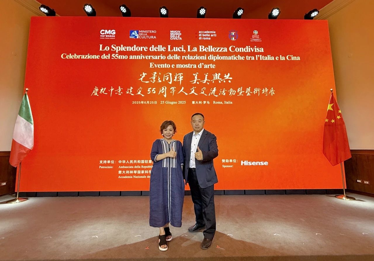 紧随其后,意大利时间6月25日,由中国中央广播电视总台联合意大利文化部、意大利人类文明博物馆、意大利罗马美术学院、意大利足球协会、意大利拉齐奥大区议会主办的“光影同辉 美美与共”——庆祝中意建交55周年艺术特展在意大利林琴国家科学院盛大开幕。
