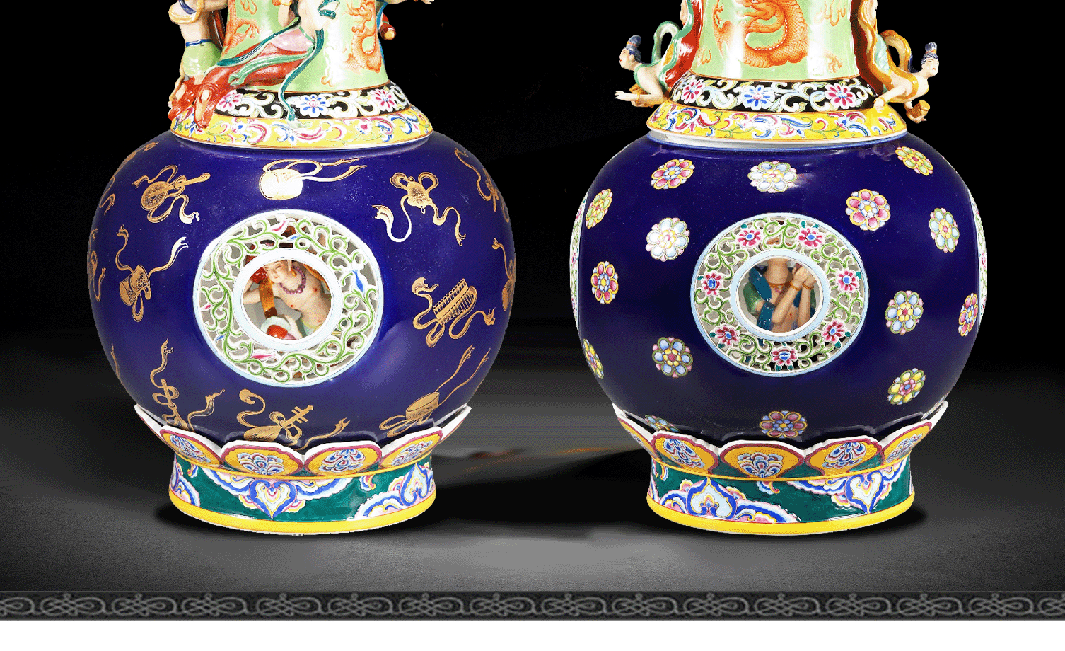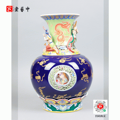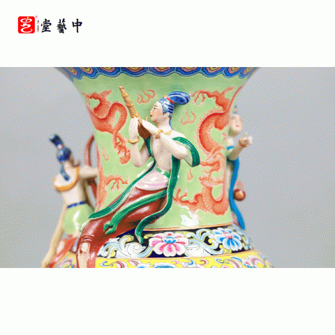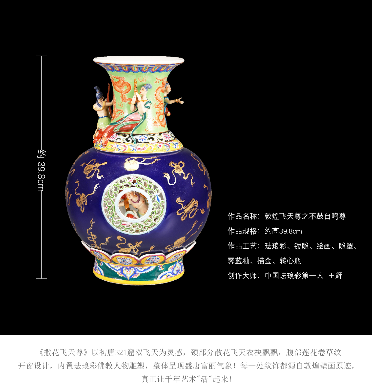 首页 > 瓷器丨内画丨书画 > 瓷器 > 王辉 > 珐琅彩《不鼓自鸣尊》 | 王辉大师再现盛唐112窟天籁胜景 | 三尊乐伎翩跹,法器自鸣,宝石蓝釉映盛唐华章